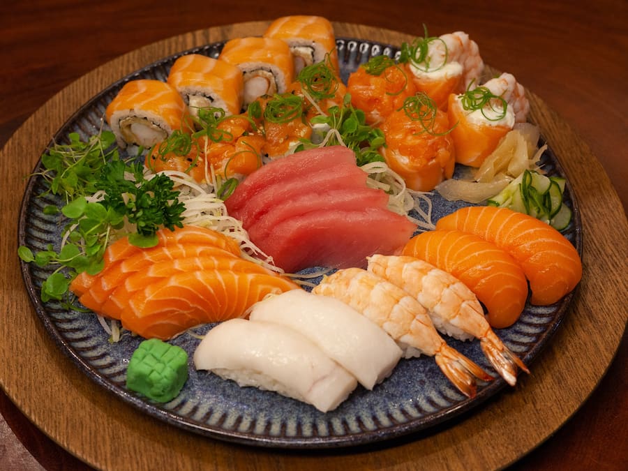 4 sashimis de salmão, 4 sashimis de atum, 2 niguiris de salmão, 2 niguris de camarão, 2 niguiris de peixe branco, 4 urashake tartar, 4 uramaki ebitem especial, 4 dyo de salmão, 4 dyo de camarão e 4 tsuri maki.