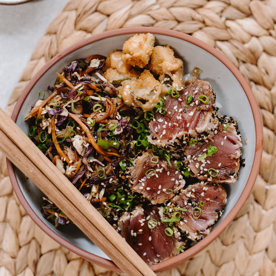 Bowl de Arroz Japonês temperado com Furikake, Mix de Legumes Oriental, Berinjela Missô e Atum selado com Crosta de Gergelim, finalizado com Gergelim Branco e Cebolinha. | 430g 👅💦Aprecie com Molho Teriyaki para um sabor único.