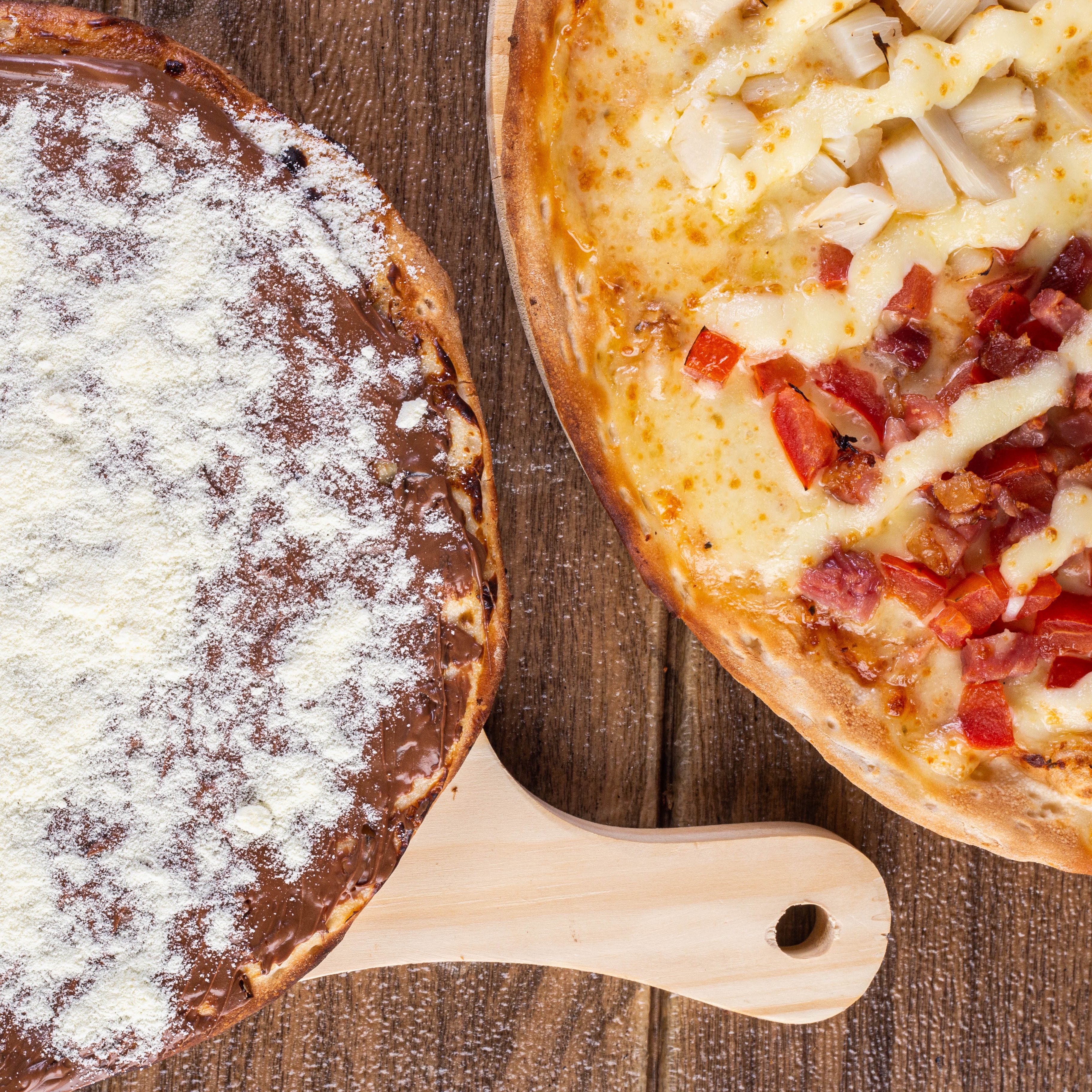 Esse combo acompanha: uma pizza família 35cm (salgada), uma pizza broto 20cm (doce) e uma bebida de sua escolha.