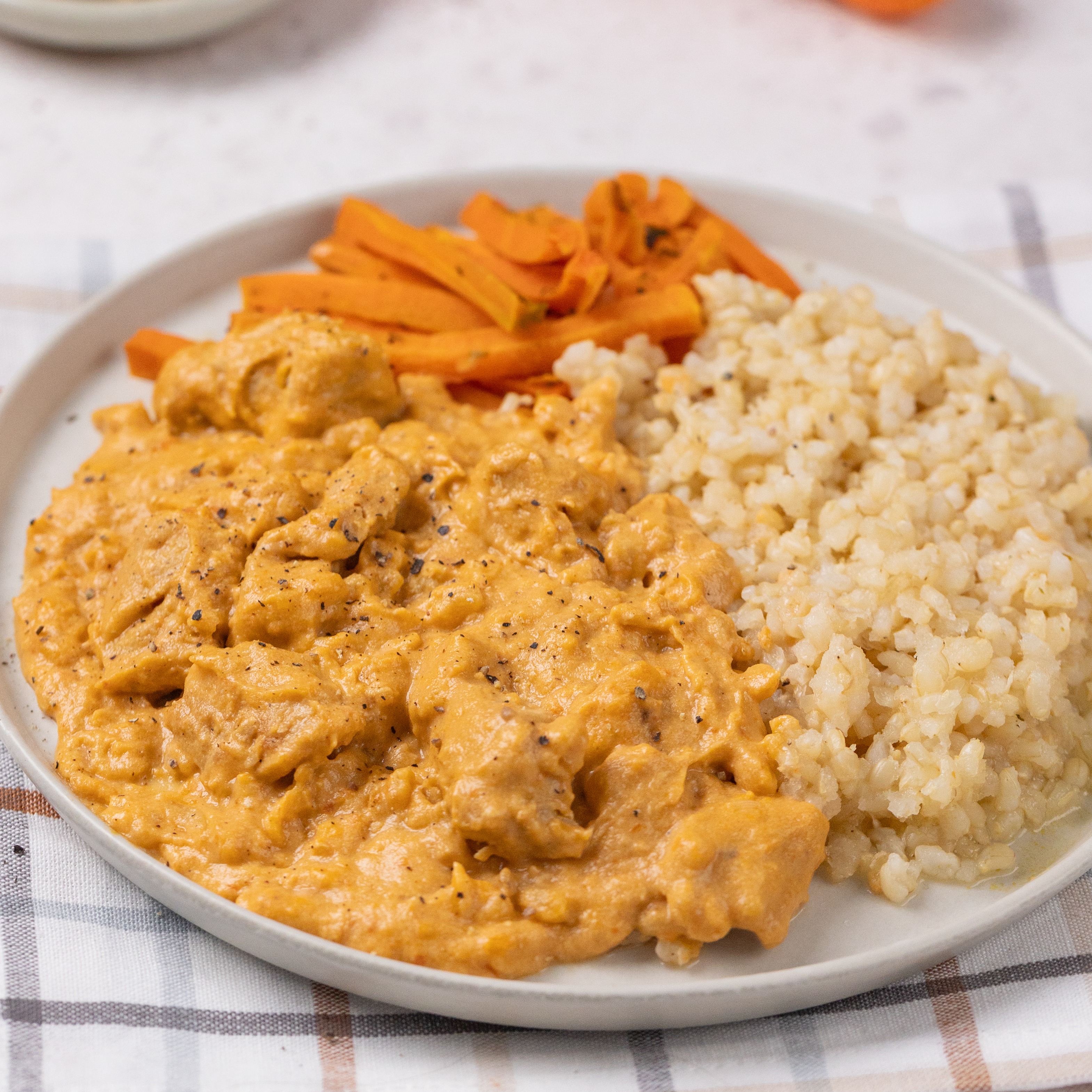 Uma refeição completa e equilibrada, feita para deixar seu dia mais gostoso e prático! Ele é feito com ketchup e molho inglês caseiros, para garantir um sabor único e artesanal. Acompanha cenouras assadas bem douradinhas e arroz cateto integral - essa refeição entrega o equilíbrio perfeito entre sabor e nutrição. Ingredientes: Estrogonofe de frango (peito de frango sem antibióticos, castanha de caju, tomate, água,cebola, azeite de oliva extravirgem, sal, vinagre de maçã, shoyo de coco, mostarda, cúrcuma, páprica, pimenta do reino, gengibre, cravo, canela, amido de milho e açúcar demerara orgânico), arroz cateto integral, cenoura e orégano. Alérgicos: contém castanhas. PRODUTO CONGELADO INFORMAÇÃO NUTRICIONAL: Porções por embalagem: 1 Porção: 400g (1 unidade de 400g) Valor Energético: 382kcal Carboidratos : 28g Açúcares totais: 5,6g Açúcares adicionais: Zero Proteínas: 30g Gorduras Totais: 18g Gordura Saturada: 3,5g Gordura Trans: Zero Fibra
