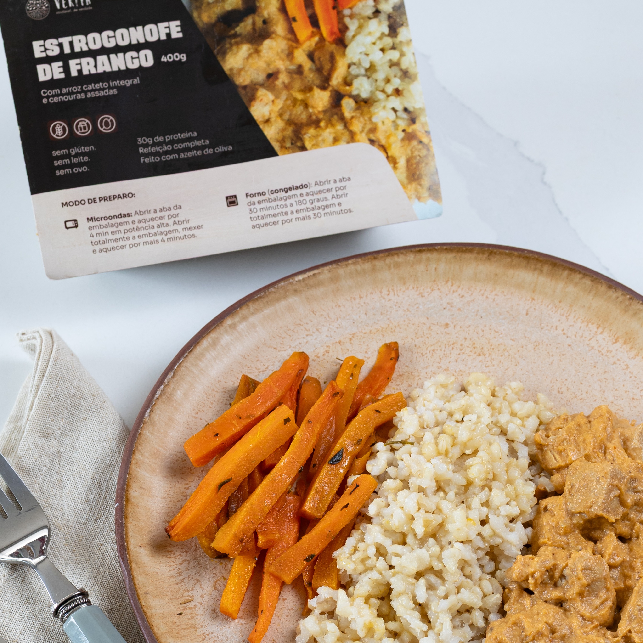 Uma refeição completa e equilibrada, feita para deixar seu dia mais gostoso e prático! Ele é feito com ketchup e molho inglês caseiros, para garantir um sabor único e artesanal. Acompanha cenouras assadas bem douradinhas e arroz cateto integral - essa refeição entrega o equilíbrio perfeito entre sabor e nutrição. Ingredientes: Estrogonofe de frango (peito de frango sem antibióticos, castanha de caju, tomate, água,cebola, azeite de oliva extravirgem, sal, vinagre de maçã, shoyo de coco, mostarda, cúrcuma, páprica, pimenta do reino, gengibre, cravo, canela, amido de milho e açúcar demerara orgânico), arroz cateto integral, cenoura e orégano. Alérgicos: contém castanhas. PRODUTO CONGELADO INFORMAÇÃO NUTRICIONAL: Porções por embalagem: 1 Porção: 400g (1 unidade de 400g) Valor Energético: 382kcal Carboidratos : 28g Açúcares totais: 5,6g Açúcares adicionais: Zero Proteínas: 30g Gorduras Totais: 18g Gordura Saturada: 3,5g Gordura Trans: Zero Fibra