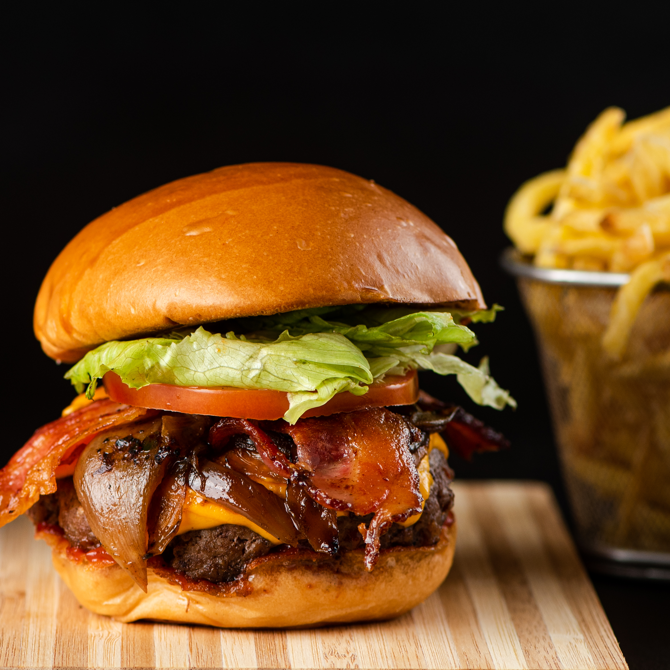 Pão Selado Na Manteiga, Hambúrguer de Blend de Carnes bovina de 140g, Cheddar Artesanal, Bacon crocante em Tiras, Cebola Caramelizada (Contém Glúten), Molho Barbecue de Bacon da Casa, Catchup, Mostarda, Alface Americana E Tomate.